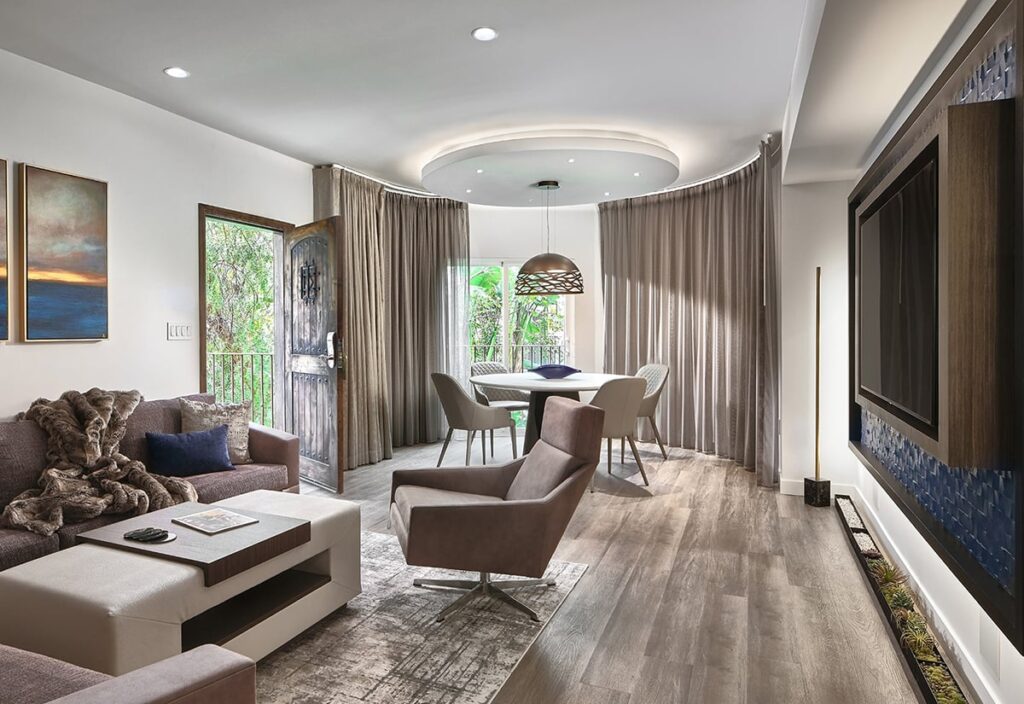 Renovation of 122 villa rooms, plus new restaurant, barista, lobby, reception, spa, and gym.